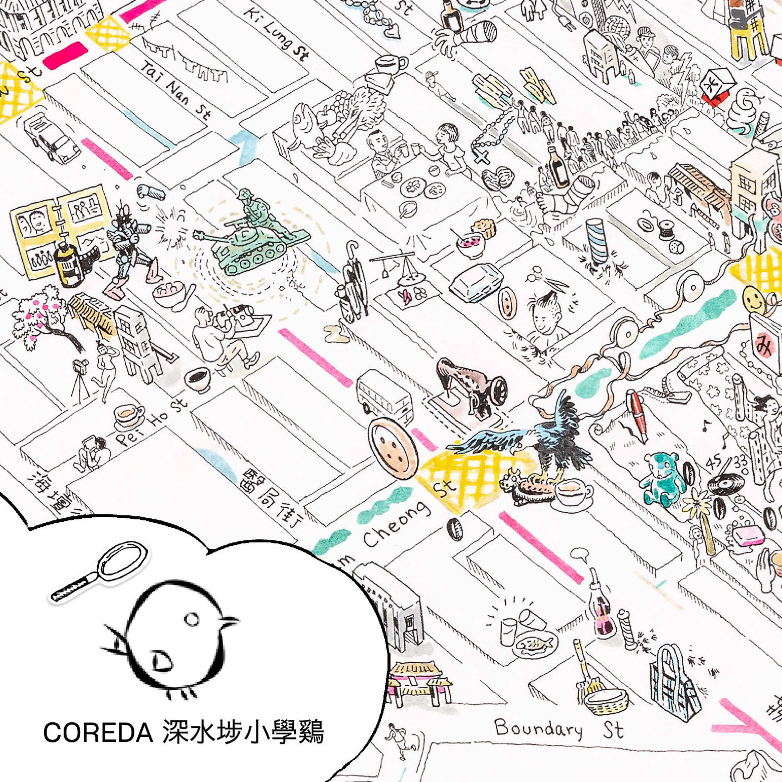 Community Reciprocity Development Action (COREDA) was established in 2014 by a group of Sham Shui Po neighbours who witnessed urban renewal in the area and volunteers who care about the Sham Shui Po community. COREDA reports the going-ons in Sham Shui Po and hosts screening events, guided-tours and workshops. 社區互助發展行動(coreda),又名深水埗小學鷄。2014年成立,由一班經歷過市區重建的深水埗街坊和關心深水埗社區的義工市民組成。平日會周圍係區八下,間中會落區搞活動。